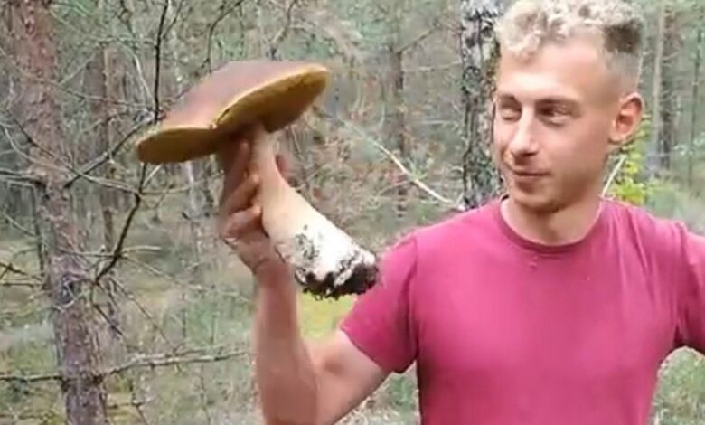 На видео два молодых человека радуются своей находке: «2 гриба и ведерко. Класс», — говорит молодой человек, удерживая в руках огромный боровик, шляпка которого шире его головы.