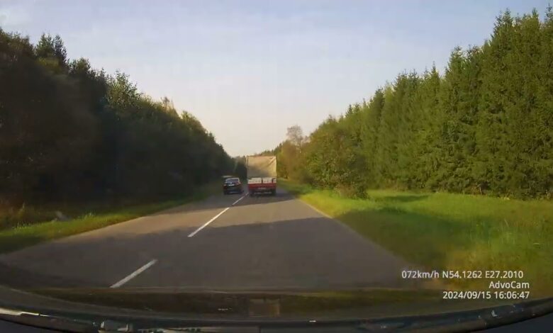 15 сентября, около 16:00, подъезд к Радошковичам. Сначала на обгон пошел водитель Skoda — успел спрятаться до поворота. За ним рискнул водитель Geely и, как отметил автор видео, чуть не натворил дел.