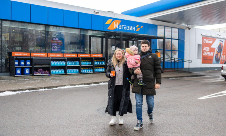 Влюблённые приехали на одну из АЗС «Газпромнефть» в Минске, где мы договорились с ними встретиться, на розовом Camaro Снежаны.