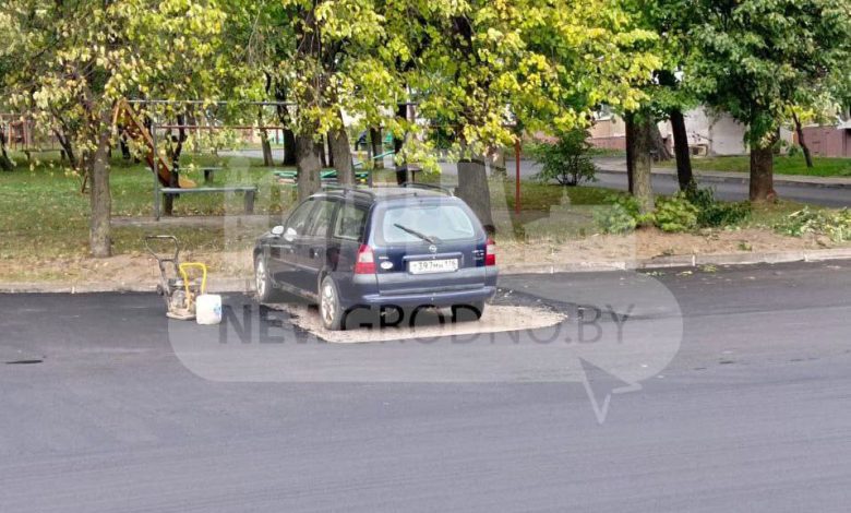 «Не могут найти водителя». Брошенная машина остановила укладку асфальта в одном из дворов в Гродно