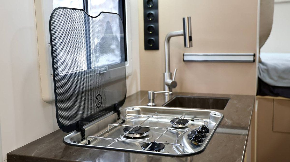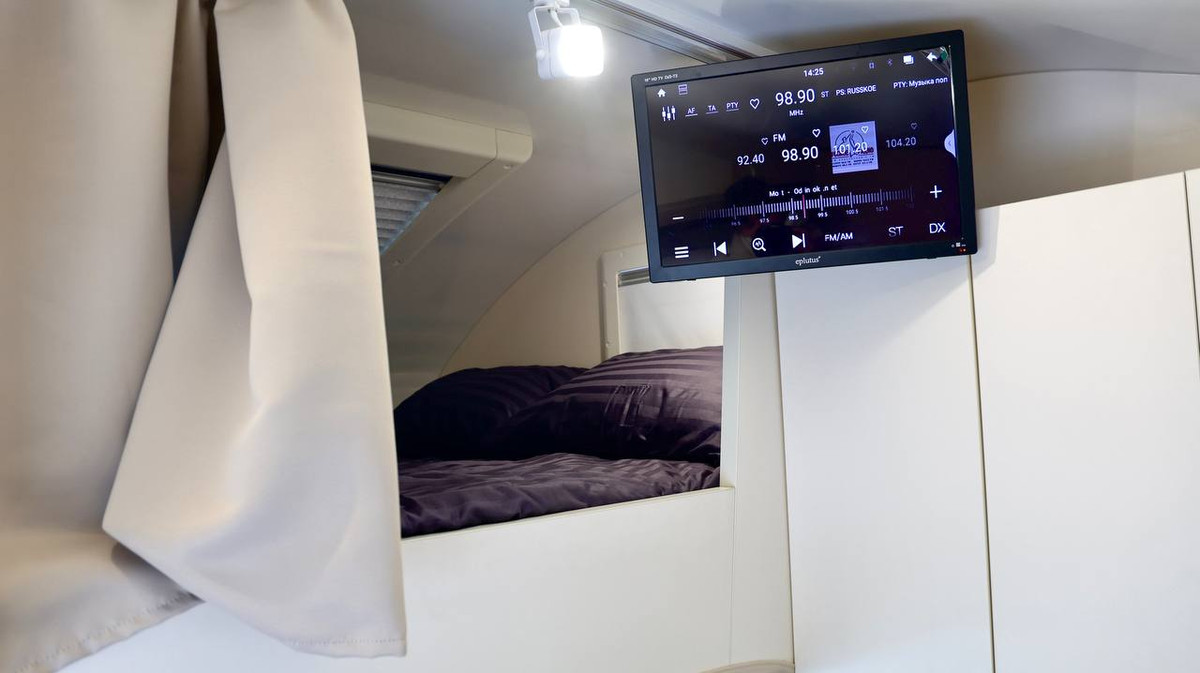 В салоне этой модели предусмотрены две спальные зоны и два комплекта постельного белья для размещения четырех человек, которые закрываются с помощью штор. Два режима освещения: дневной и ночной. Машина оснащена газовой варочной панелью с газовым баллоном на 27 л, вытяжкой, мойкой со смесителем, встроенным шкафом с мини-холодильником объемом 92 л, а также отсеками для размещения кухонной утвари.