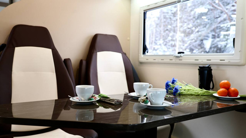 Столовая группа представляет собой стол с подстаканниками и четыре места для сидения, два из которых — поворотные. Имеется телевизор, который транслирует информацию с USB-флеш-накопителя или видеомагнитолы. Санитарный узел включает мойку, туалет, душ и нить для сушки вещей.