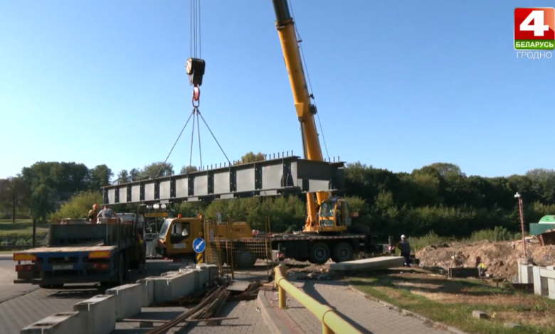 На улице Рыбацкой в Гродно начался монтаж металлоконструкции моста через реку Городничанка. Его вес составляет более 20 тонн.