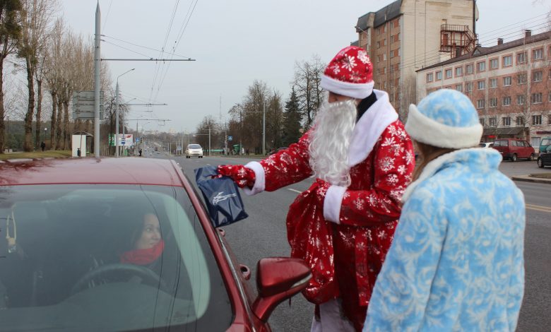 В последнюю рабочую неделю уходящего года сотрудники Гродненской ГАИ в костюмах Деда Мороза и Снегурочки поздравили гродненцев с наступающими праздниками.