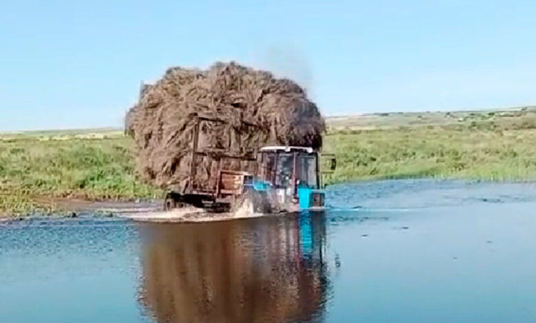 Трактор МТЗ преодолел водоем напрямик, но с одним нюансом: к технике был прицеплен огромный стог сена.