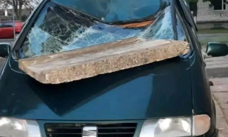 Там бетонная плита упала с пятиэтажки и разбила припаркованный автомобиль Seat. Говорят, плиту сдуло ветром. Автомобиль серьезно пострадал.