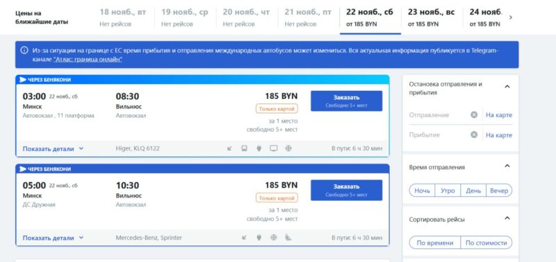 В частности, в приложении и на сайте сервиса Атласбас уже можно купить билеты на автобусы «Минск-Вильнюс», следующие через пункт пропуска «Бенякони», отправлением в 3.00 и 5.00. Первый выезд – 22 ноября. Цена билета – 185 рублей. В обратном направлении эти рейсы выезжают в 11.35 и 15.10, рассказывает журнал Атлас.