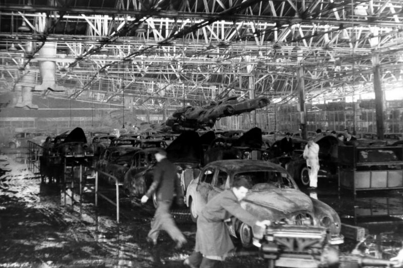 Но ночью 12 февраля 1957 года на заводе в Браунс-Лейне вспыхнул пожар. Причину возгорания так и не установили. Огонь быстро перекинулся на цеха и склады, где хранились тонны масла, покрышек и листового алюминия для кузовов. Это было идеальное топливо для огня.