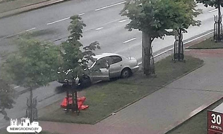 Вырвало колесо. В Гродно у драмтеатра легковушка наскочила на бордюр и вылетела с дороги (Видео)