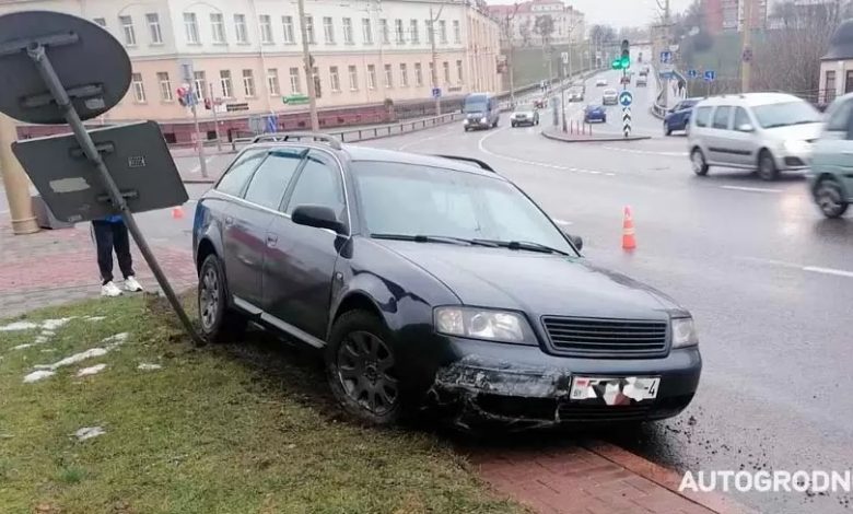 В центре Гродно минивэн «кинул» Audi с ребенком в дорожный знак. Водитель ищет очевидцев