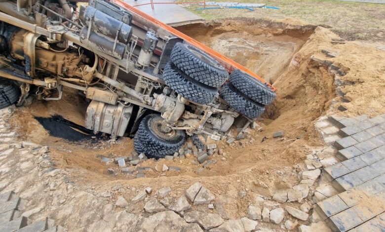 В ЖКХ прокомментировали провал МАЗа в яму возле магазина в Грандичах