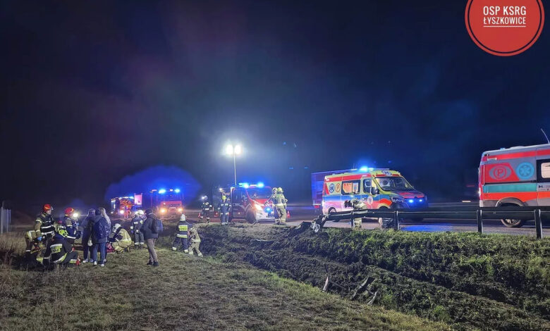 Рейсовый автобус съехал в кювет и перевернулся неподалеку от города Познань, его пассажирам понадобилась медицинская помощь.