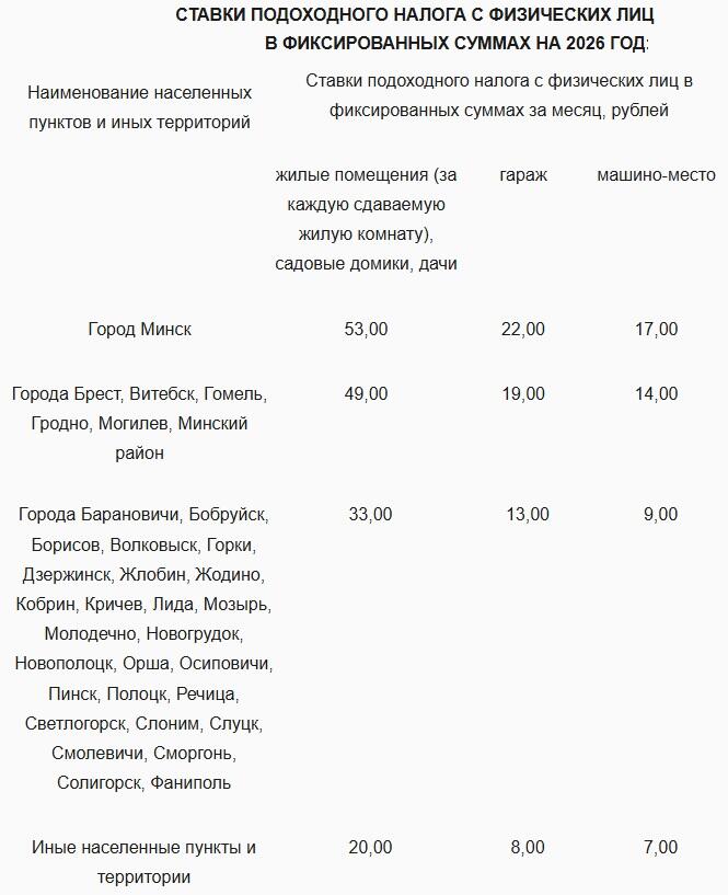 Напомним, что речь идёт о фиксированной сумме налога, которую платят физические лица при сдаче недвижимости другим физлицам (без оформления ИП). Ставки установлены согласно актуальной редакции Налогового кодекса Республики Беларусь на 2026 год.