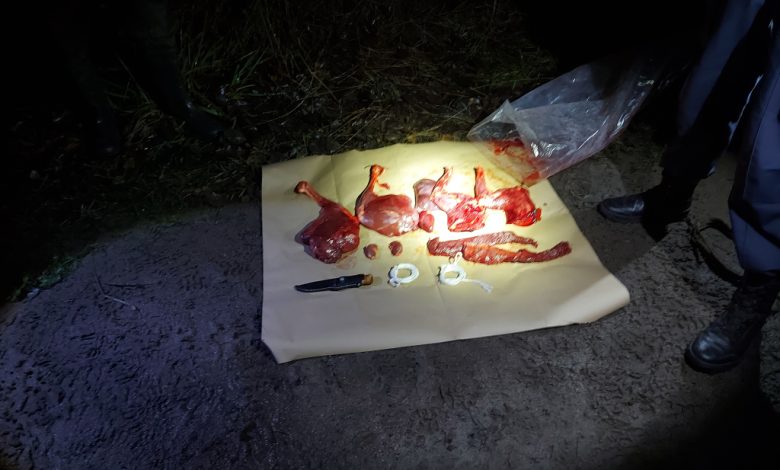 В ходе проведения полевого мероприятия на территории охотничьих угодий Солигорского района в ночное время внимание работников Солигорской межрайонной инспекции привлекли выстрелы и передвигающиеся по угодьям граждане на мотоцикле, которые явно осуществляли поиск диких животных с использованием осветительных приборов. В момент принудительной остановки транспортного средства один из мужчин скрылся в лесном массиве, преодолев мелиоративный канал, при этом обронил свой вещмешок. В оставленной клади госинспекторы обнаружили мясо косули и охотничий нож. Косуля была добыта незаконно, без разрешительных документов, то есть без разрешения на добычу охотничьего животного и охотничьей путёвки к нему.