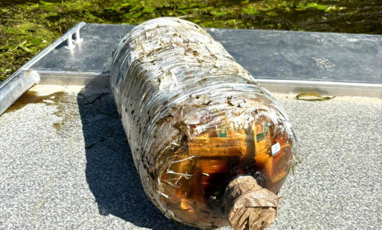 Литовские пограничники патрулировали границу недалеко от Друскининкая и заметили подозрительный предмет, застрявший в грязи. Они добрались к нему на лодке и обнаружили, что это 19-литровая пластиковая бутылка, набитая сигаретами.