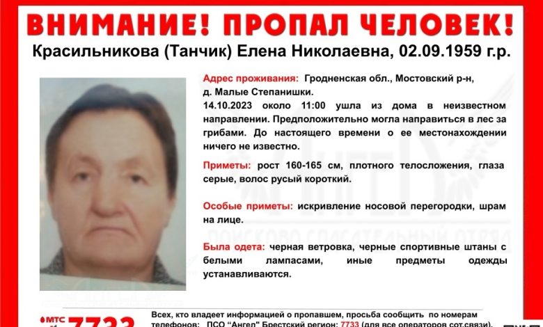 Милиция и волонтеры ищут Красильникову (Танчик) Елену Николаевну, жительницу деревни Малые Степанишки Мостовского района. В минувшую субботу, 14 октября, она вышла из дома и пропала.