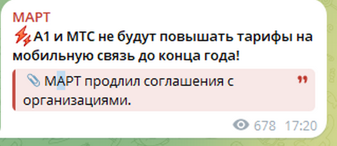 Как сообщает портал blizko.by, информация была обнародована 8 октября через официальный Telegram-канал министерства. В сообщении ведомства лаконично указано, что «А1 и МТС не будут повышать тарифы на мобильную связь до конца года». Других подробностей о условиях продления соглашений не приводится