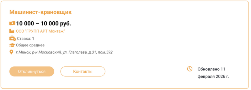 Самую высокооплачиваемую вакансию в этой подборке предлагает компания «ГРУПП АРТ Монтаж». Требуется крановщик 8-го разряда. Работа постоянная, на территории Минска. Судя по информации в интернете, обучиться на крановщика можно за 14 недель.