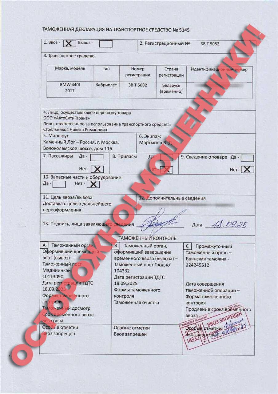 Вместе с обращениями люди приносят в таможенные органы поддельные документы. Среди них — копии деклараций с пометкой «ввоз запрещен» и даже удостоверения на транспортные средства, которые были отменены еще год назад.