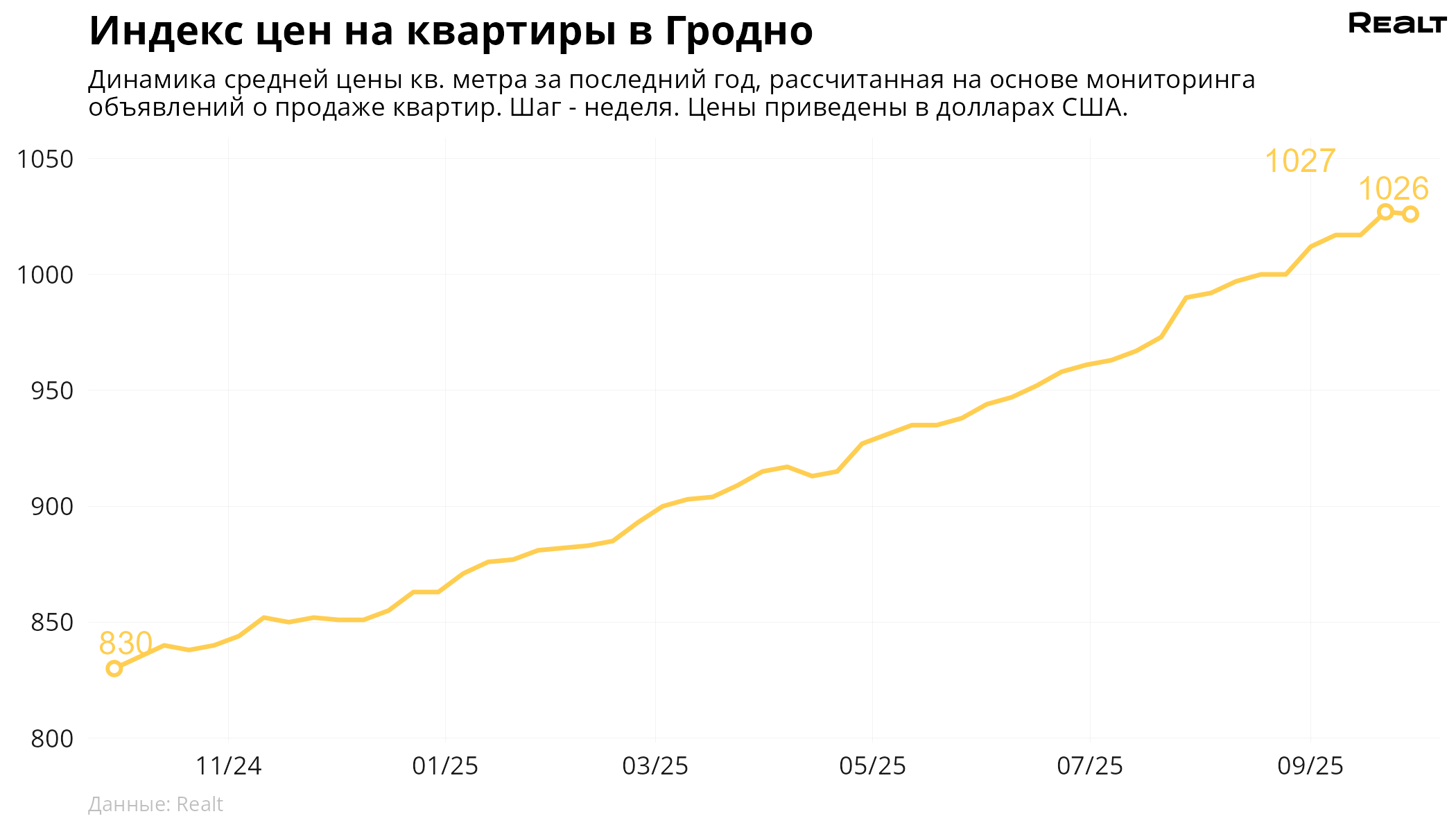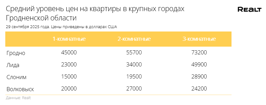 Ситуация в регионе неоднородная. В то время как в Гродно цены слегка просели, в Лиде они, наоборот, выросли на 0.5%. А в Слониме и Волковыске стоимость «квадрата» осталась без изменений.