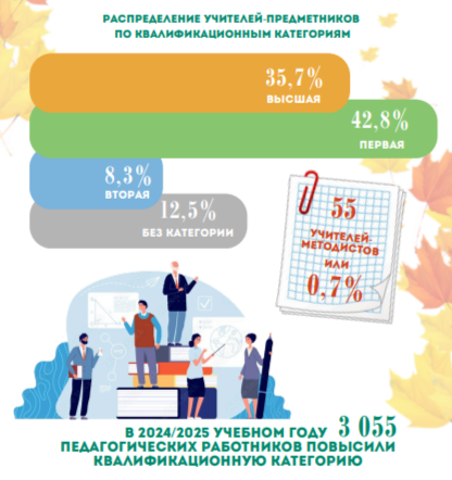 За прошлый год более 3000 педагогов повысили квалификационную категорию. Всего в регионе почти 36% учителей имеют высшую категорию, свыше 42% — первую.