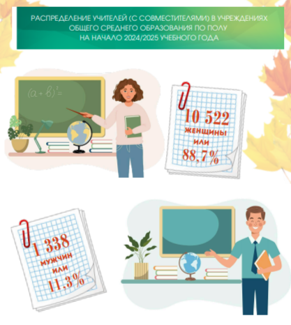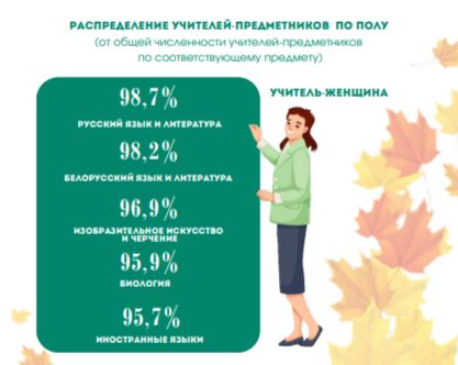 Больше всего женщин среди учителей русского и белорусского языков и литературы, иностранных языков и биологии. А вот мужчины чаще всего преподают физкультуру, физику, труды и историю.