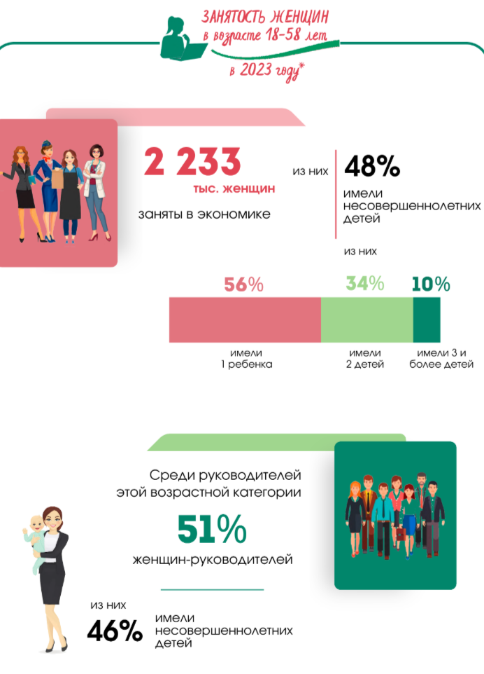 Что касается работы, то среди женщин от 18 до 58 лет трудоустроены 2,2 миллиона человек. Почти у каждой второй из работающих (48%) есть несовершеннолетние дети. Чаще всего в таких семьях один ребенок (56,9%), реже — двое (33%) или трое и больше (10%).