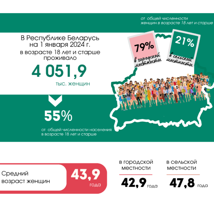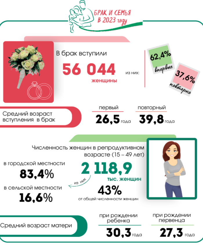 В 2024 году замуж вышло 46 242 белоруски. Впервые замуж женщины обычно выходят в 27 лет, а если брак повторный — то в среднем в 40. Мамами они также становятся в сознательном возрасте: средний возраст рождения ребенка составляет 27,6 лет.