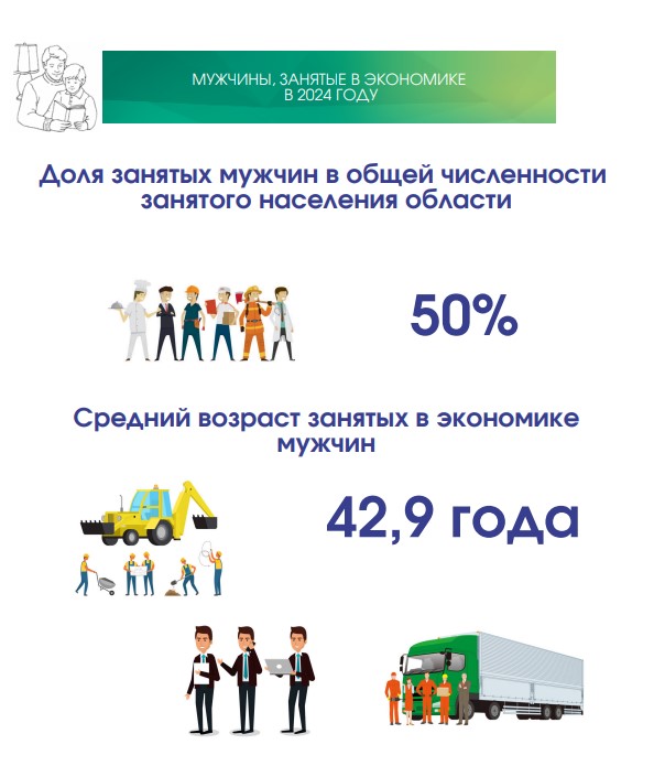 Мужчины, конечно, же активно работают. Средний возраст представителя сильного пола, задействованного в экономике, составляет 42,9 лет. У большинства работников профессионально-техническое образование (35,6%), около трети из них имеют высшее образование.