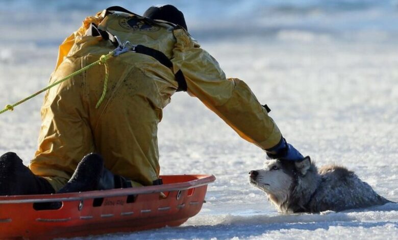 Бостонский пожарный Шон Коул отважился подъехать к 13-летней собаке породы хаски, на ледянках по крайне непрочному льду. В результате собака была спасена на радость хозяину.