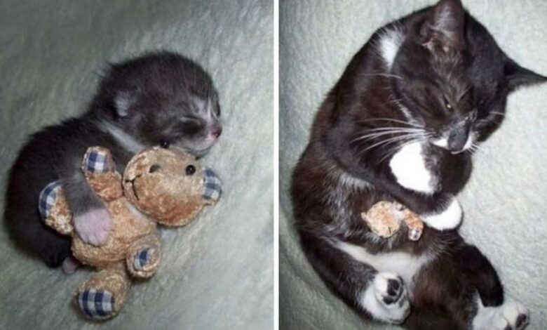 На этих фотографиях в стиле «до и после» вы увидите очаровательных животных, которые растут, не расставаясь со своими любимыми игрушками.