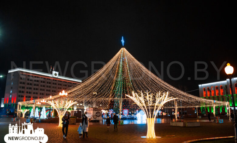 «Город в разных местах украсят 15 зеленых красавиц, шесть из них будут живые цельные деревья, — рассказал главный инженер УКПП «Горсвет» Александр Трофимович. — Но каркасная ель из живых деревьев будет только одна — на площади Ленина. Над ней обустроим «звездное небо» — 192 луча из гирлянд по 40 м каждый будут расходиться от верхушки во все концы площади. Только на «звездное небо» пойдет порядка 8 км гирлянд. Венчать ель будет звезда».