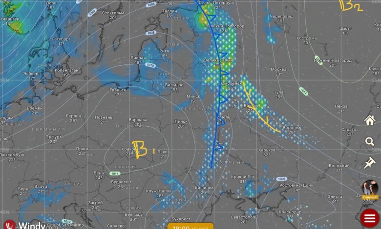 Сегодня антициклон «В1» постепенно вытеснит атмосферный фронт с территории Беларуси. Но перед этим, как прогнозирует ECMWF, фронт ещё проявит себя во второй половине дня над восточной половиной страны. Здесь грозы, ливни, наиболее интенсивные ожидаются на севере РБ.