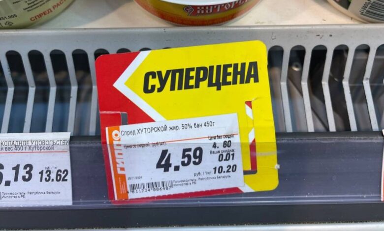 Речь о супермаркете «Гиппо» на улице Городецкой. Именно здесь минчанин заметил на полке акционный товар — спред «Хуторской» (если вдруг не знаете, это растительный аналог сливочного масла). Упаковка весом 450 грамм была помечена яркой этикеткой с надписью «Суперцена»: вместо 4 рублей 60 копеек — 4,59! Выгода — целая копейка!