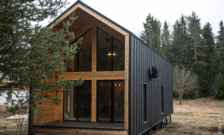 Стоит отметить, что дом Дениса только номинально считается дачным — по всем параметрам это полноценное загородное жилье с удобствами городской квартиры. Снаружи барнхаус обшит металлом графитового цвета — для крыши и двух длинных стен использовался клик-фальц. Материал листовой, нарезается на производстве под заданные размеры, поэтому на месте его нужно лиши смонтировать. Благодаря специальному замку, картины легко и надежно соединяются. Торцы строения обшиты сосновым планкеном — его еще необходимо покрыть пропиткой.