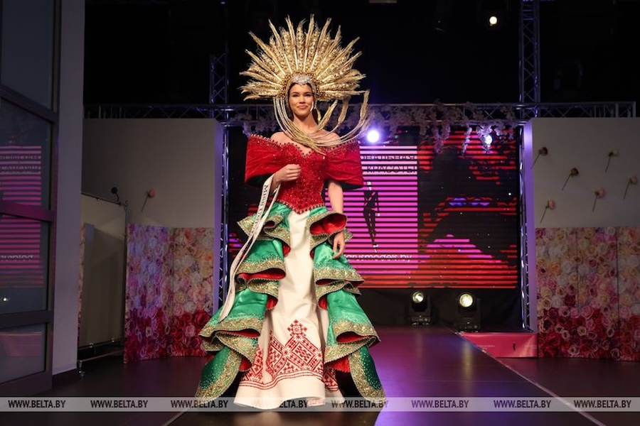 Над этим костюмом Алены Кучерук дизайнеры совместно с Национальной школой красоты трудились почти два месяца. Изучали яркие наряды девушек из Африки, Азии, где в одном образе сочетается буйство красок. Но решили, что представительнице Беларуси это не подходит. Потому вернулись к цветам и орнаменту, вдохновившись государственными флагом и гербом.
