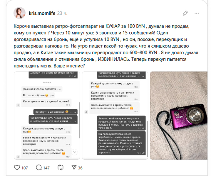 Утром ей написал «какой-то чувак», который заявил, что она слишком дешево продает аппарат и что в Китае такие «мыльницы» перепродают по Br600–800.