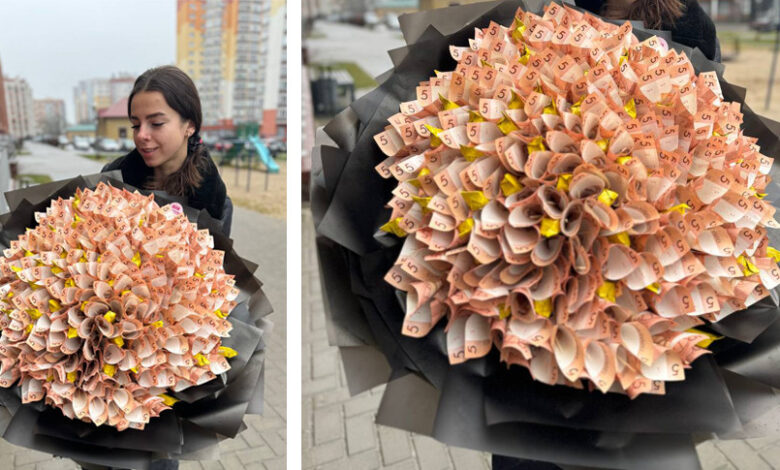 Жительница Бреста Анастасия, которая делает букеты, разместила в своем аккаунте в TikTok необычный заказ: ее попросили сделать букет из денег. Вместо цветов использованы белорусские 5-рублевые банкноты и конфеты.