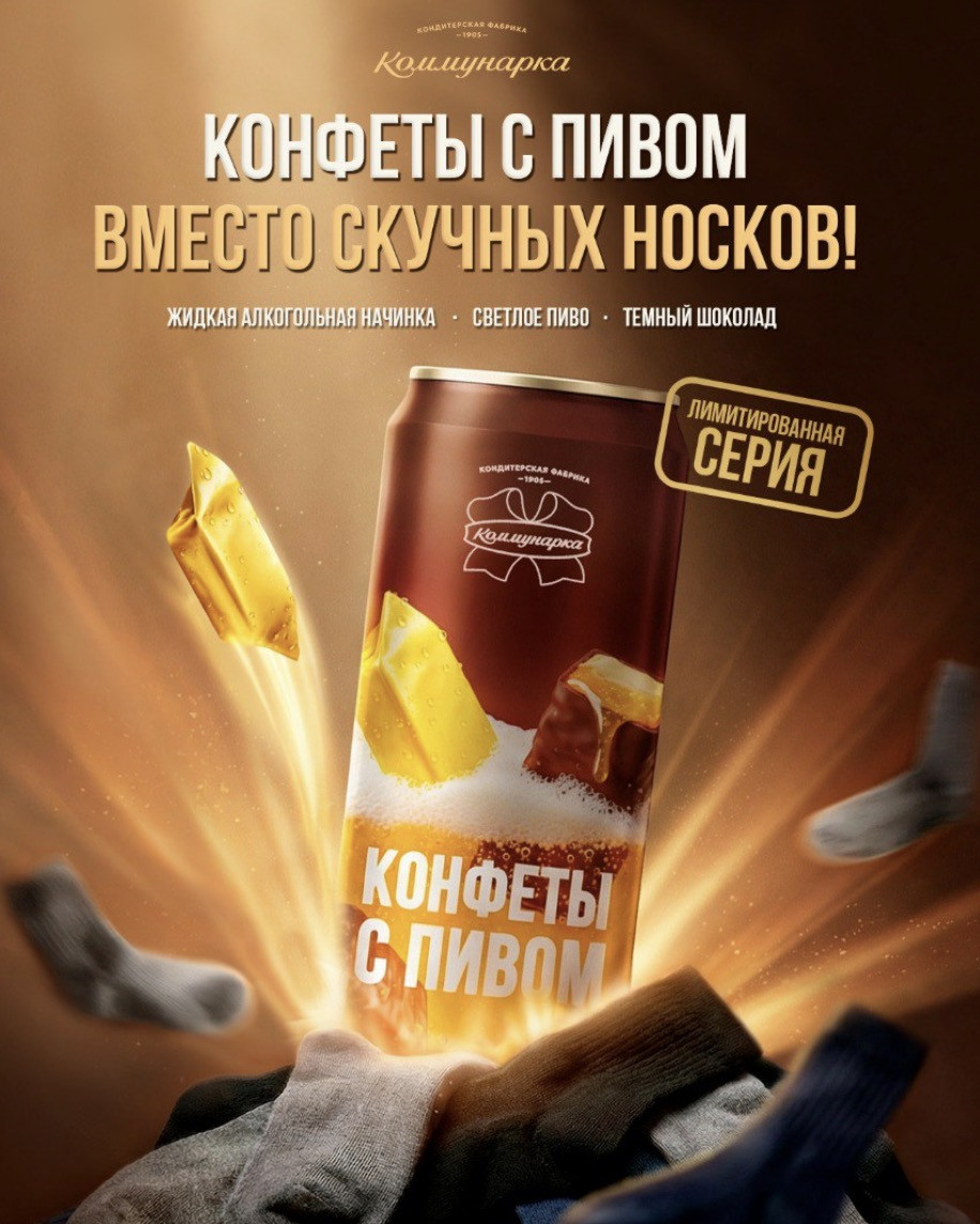 «Коммунарка» выпустила лимитированную серию конфет с добавлением светлого пива — к 23 февраля. Внутри — шоколадная оболочка, помадный слой и жидкая начинка на пивной основе, вкус которой производитель называет «хмельным». Новинку уже начали поставлять в фирменные магазины.
