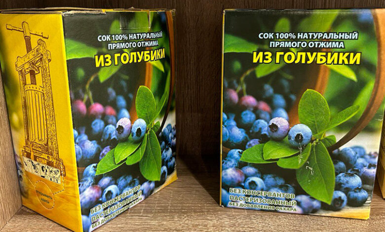 Три литра голубичного сока упаковывают в бумажный пакет вместо стеклянной банки. В составе только сок прямого отжима, сахар не добавляют. В таком виде он хранится год. Яблочно-голубичный сок в магазинах можно встретить, а вот чисто из голубики — редкость.