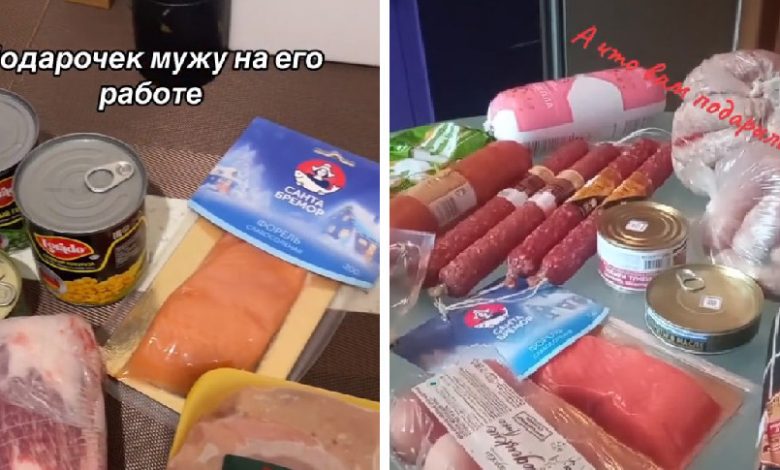 «Филе форели, индейка, две палки колбасы, свинина для полендвицы, бастурма, банка оливок, две пачки майонеза, сыр, три пачки масла. А еще шоколадные конфеты „Коммунарка“, которые на фото не попали», — рассказала нам читательница.