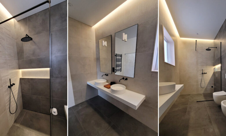 Когда все было готово, для швов мы использовали двухкомпонентную эпоксидную затирку Litokol. Часть стены возле входа, где размещен полотенцесушитель, мы заштукатурили и покрасили белой краской для ванных комнат.