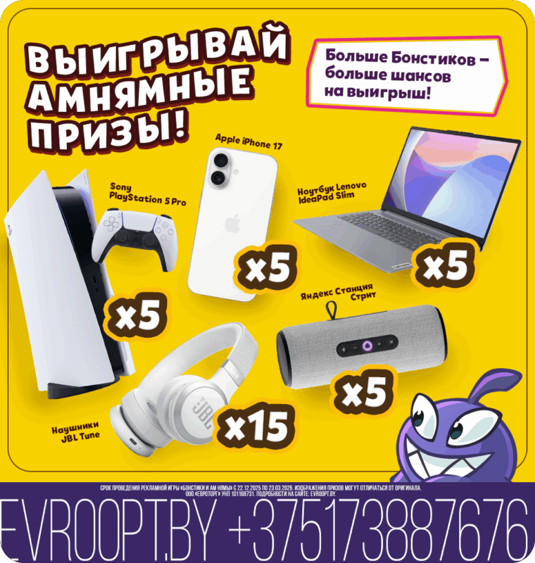 - С 22 декабря 2025 года по 18 января 2026 года покупать Бонстиков с применением бонусной карты «Еплюс» в магазинах «Евроопт» и «Хит!».