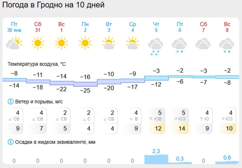 Температура воздуха ночью составит 18-24 градуса ниже нуля, в отдельных районах — минус 25-28, по югу — минус 14-17 градусов. Днем будет 10-16 градусов мороза, по северо-востоку — минус 17-19.