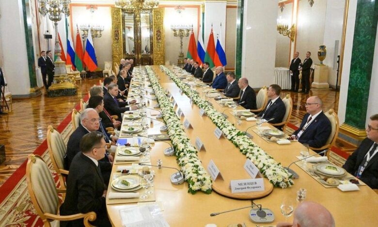 На официальном завтраке, который последовал после переговоров президентов России и Беларуси Владимира Путина и Александра Лукашенко, присутствовали не только главы государств, но и делегации двух стран.