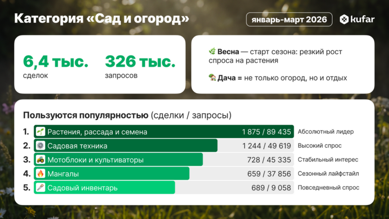 С началом весны дачный сезон в Беларуси набирает популярность, и интерес к садоводству и дачным товарам продолжает расти. На Куфаре наблюдается активный спрос: посетители покупают рассаду, садовую технику и товары для отдыха на природе. Мы проанализировали категорию «Сад и огород»: в первой половине 2026 года уже можно наблюдать более 6 400 сделок и более 326 тысяч запросов. Это подтверждает, что дача для многих белорусов становится не только местом для работы, но и уютным уголком для полноценного отдыха.