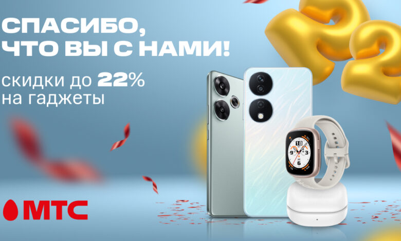 МТС исполнилось 22 года! В знак благодарности за доверие мы предлагаем своим абонентам персональную скидку на устройства и гаджеты до 22%. Приобрести их можно единым платежом, а также в рассрочку до 24 месяцев без первого взноса. Предложение действует в рамках акции «Спасибо, что вы с нами».