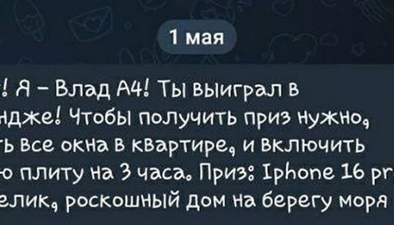 Неизвестные от имени популярного блогера Влада А4 присылают сообщения в социальные сети. Целевая аудитория – дети. Под видом челленджа им предлагают выполнить задания: закрыть все окна в квартире и включить газовую плиту на три часа.
