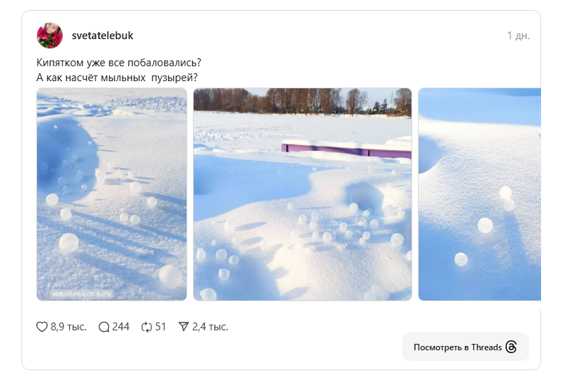 Хотя этот тренд не нов, сильные холода в Беларуси случаются не каждый год. Именно поэтому в последние дни эксперименты с кипятком на морозе стали особенно популярны. Впрочем, такое увлечение находит как энтузиастов, так и критиков.