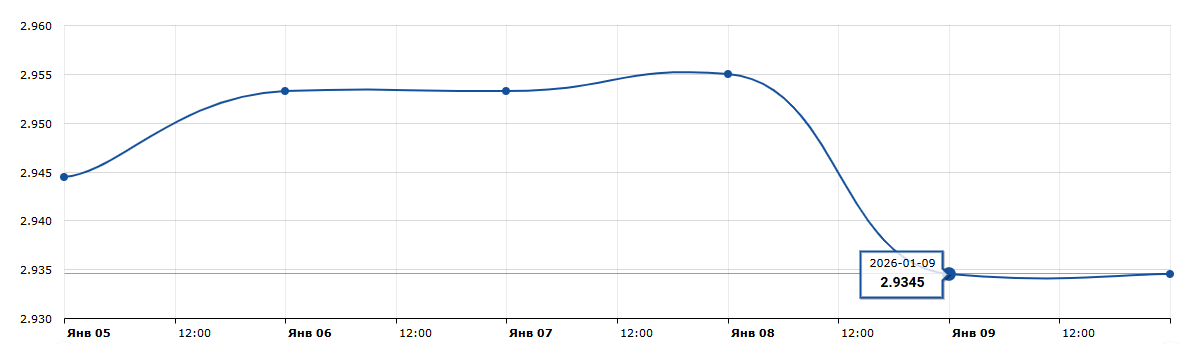 По итогам второй (и опять немного сокращённой из-за рождественских праздников) недели января курс белорусского рубля к доллару США ослабел на 1,10%. Правда, на последних торгах в пятницу, 9 января, доллар «скинул» -0,69% и остановился на USD/BYN 2,9345, хотя всю неделю «бакс» рос в цене до USD/BYN 2,9550 в четверг, 8 января. В тот же день объём торгов вырос до 23,105 млн долларов и всего за неделю объём составил 61,813 млн долларов США.